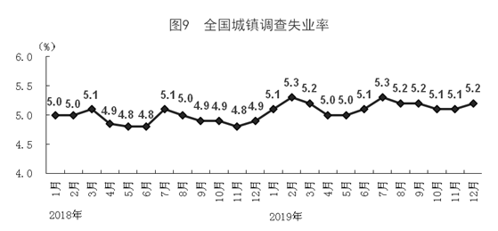 全年城鎮(zhèn)新增就業(yè)1352萬人,連續(xù)7年保持在1300萬人以上,明顯高于1100萬人以上的預(yù)期目標(biāo),完成全年目標(biāo)的122.9%。12月份,全國城鎮(zhèn)調(diào)查失業(yè)率為5.2%,2019年各月全國城鎮(zhèn)調(diào)查失業(yè)率保持在5.0%-5.3%之間,實現(xiàn)了低于5.5%左右的預(yù)期目標(biāo)。全國主要就業(yè)人員群體25-59歲人口調(diào)查失業(yè)率為4.7%。12月份,31個大城市城鎮(zhèn)調(diào)查失業(yè)率為5.2%。2019年末,城鎮(zhèn)登記失業(yè)率為3.62%,比上年末降低0.18個百分點,符合4.5%以內(nèi)的預(yù)期目標(biāo)。年末全國就業(yè)人員77471萬人,其中城鎮(zhèn)就業(yè)人員44247萬人。全年農(nóng)民工總量29077萬人,比上年增加241萬人,增長0.8%。其中,本地農(nóng)民工11652萬人,增長0.7%;外出農(nóng)民工17425萬人,增長0.9%。農(nóng)民工月均收入水平3962元,比上年增長6.5%。