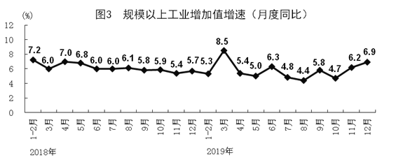 全年全國規(guī)模以上工業(yè)增加值比上年增長5.7%。分經(jīng)濟(jì)類型看,國有控股企業(yè)增加值增長4.8%;股份制企業(yè)增長6.8%,外商及港澳臺商投資企業(yè)增長2.0%;私營企業(yè)增長7.7%。分三大門類看,采礦業(yè)增加值增長5.0%,制造業(yè)增長6.0%,電力、熱力、燃?xì)饧八a(chǎn)和供應(yīng)業(yè)增長7.0%。高技術(shù)制造業(yè)和戰(zhàn)略性新興產(chǎn)業(yè)增加值分別比上年增長8.8%和8.4%,增速分別比規(guī)模以上工業(yè)快3.1和2.7個百分點。12月份,規(guī)模以上工業(yè)增加值同比增長6.9%,比上月加快0.7個百分點,環(huán)比增長0.58%。12月份,制造業(yè)采購經(jīng)理指數(shù)(PMI)分項指數(shù)中,生產(chǎn)指數(shù)、新訂單指數(shù)和供應(yīng)商配送時間指數(shù)分別為53.2%,51.2%和51.1%,均高于臨界點。制造業(yè)生產(chǎn)經(jīng)營活動預(yù)期指數(shù)為54.4%,位于較高景氣區(qū)間。